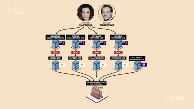 «Моя дружина не займається бізнесом, вона ним володіє. А управляю ним я. Чому я не можу володіти бізнесом? Тому що мої «любі» американці від березня 2014-го запровадили щодо мене санкції», – заявив у вересні 2018 року в ефірі телеканалу NewsOne Віктор Медведчук. Так тоді ще не народний депутат, але вже член партії «За життя» Медведчук прокоментував розслідування програми «Схеми» про те, що його дружина Оксана Марченко володіє нафтовим бізнесом у Росії через компанії, зареєстровані на Кіпрі.